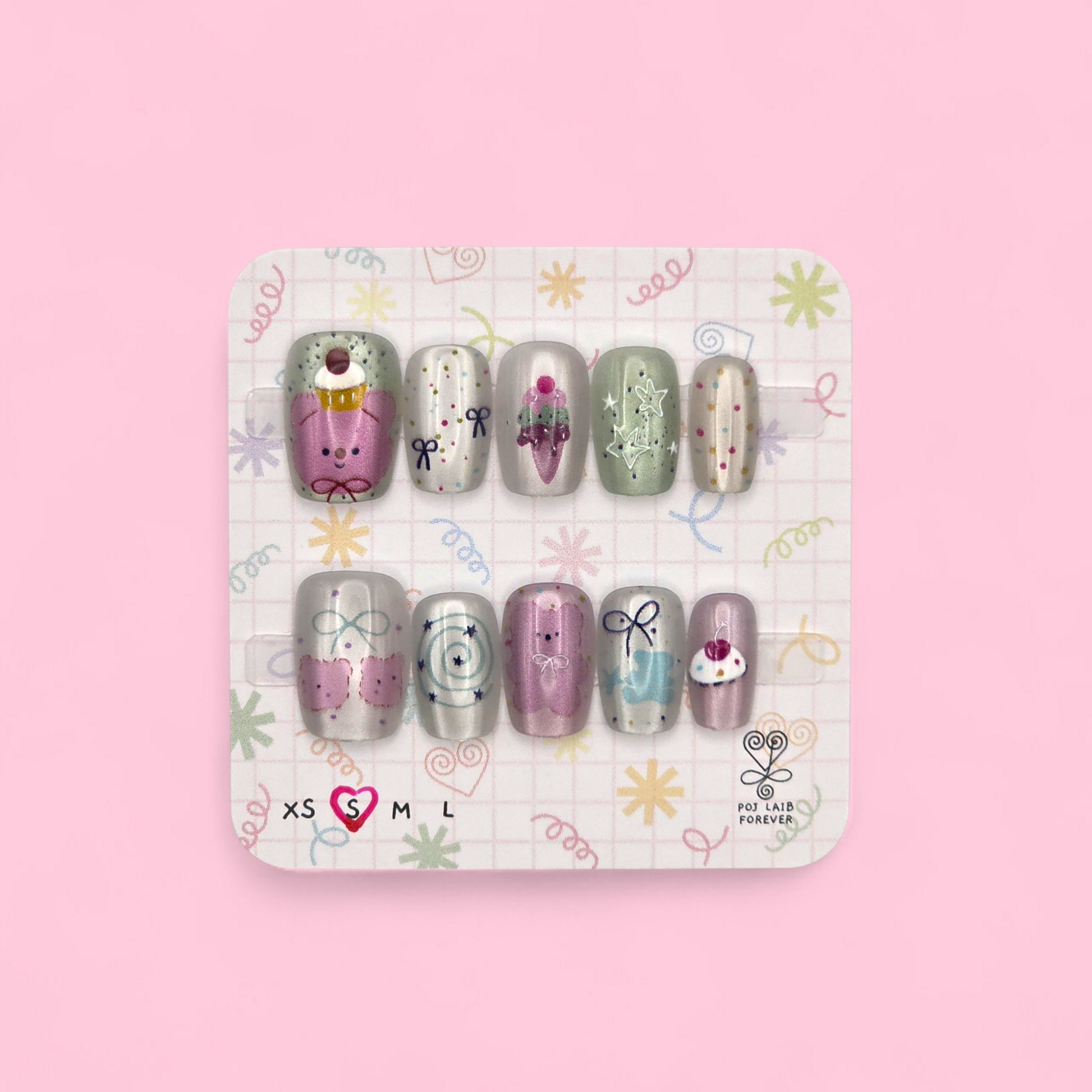 A pastel celebration of all things sweet and cute! This playful set features cupcake, ice cream, and bear charms with delicate ribbons and sprinkles that make every nail a tiny dessert dream. Perfect for anyone who loves kawaii vibes, colorful details, and a little sugar-coated happiness.