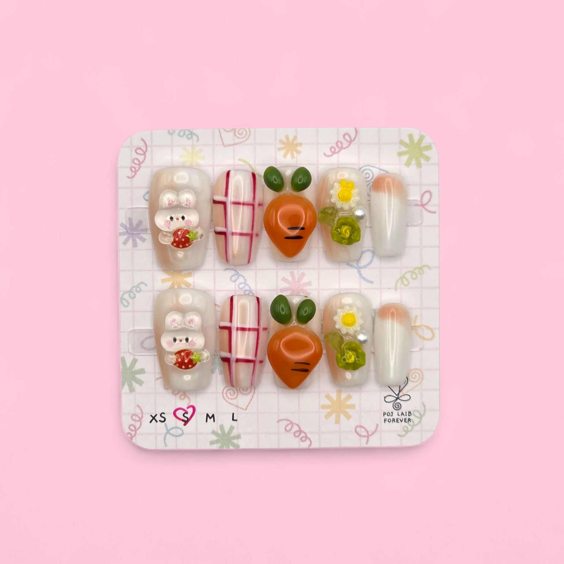 Cute, cottagecore, and full of spring energy. These pastel nails feature an adorable bunny holding a strawberry, with carrots, flowers, and bows for that garden fairy vibe. The soft blush tones bring a sweet touch of charm, perfect for anyone who loves playful yet aesthetic designs. Step into your berry bunny era and let your hands bloom with cuteness.