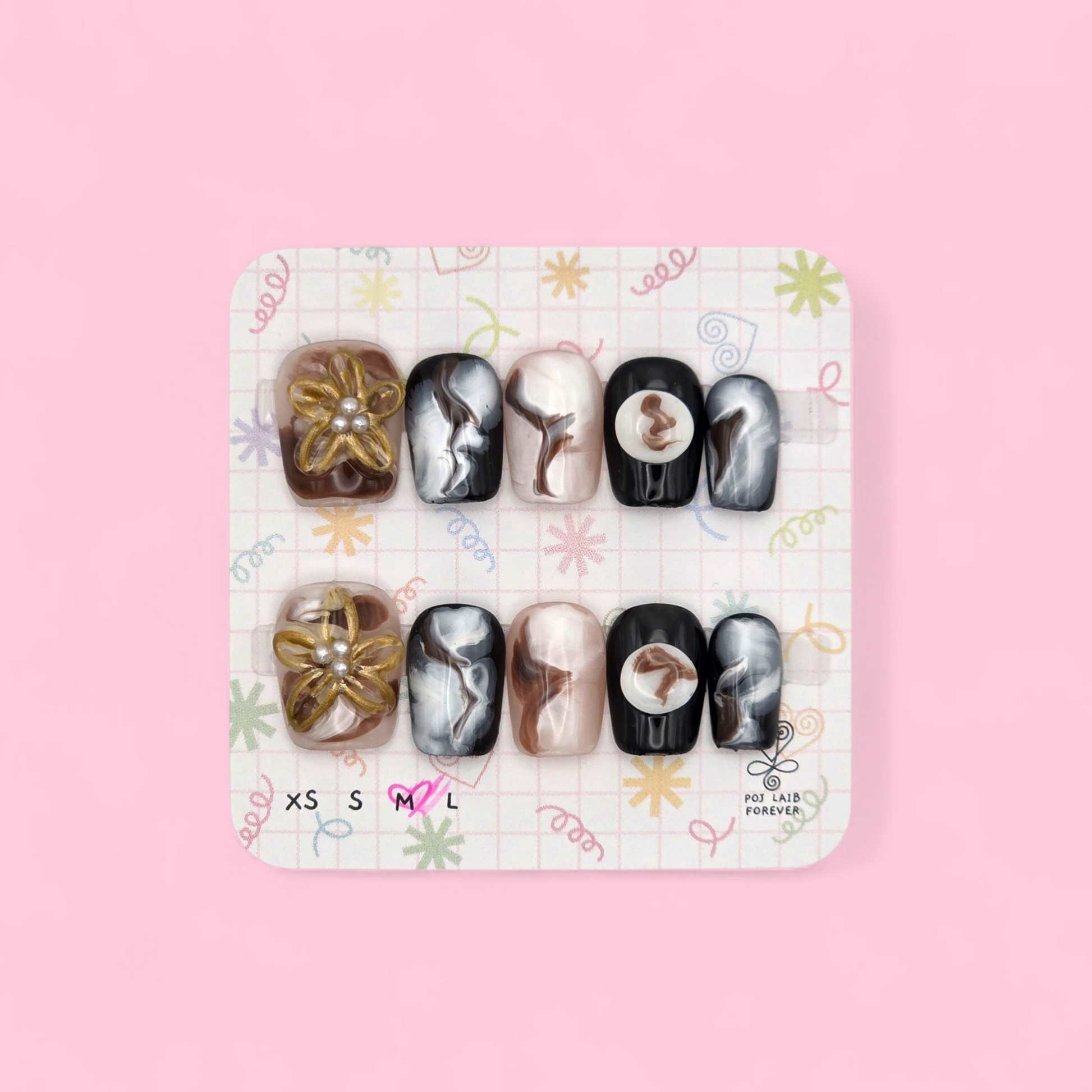 Rich, bold, and unapologetically stylish, Me Espresso is a swirl of mocha, cream, and black marble with glossy gold accents and 3D florals. Each nail feels like a mini latte art masterpiece, hand-designed to make your look stand out with warmth and edge. Perfect for coffee lovers and dreamers who sip, shine, and slay all day.