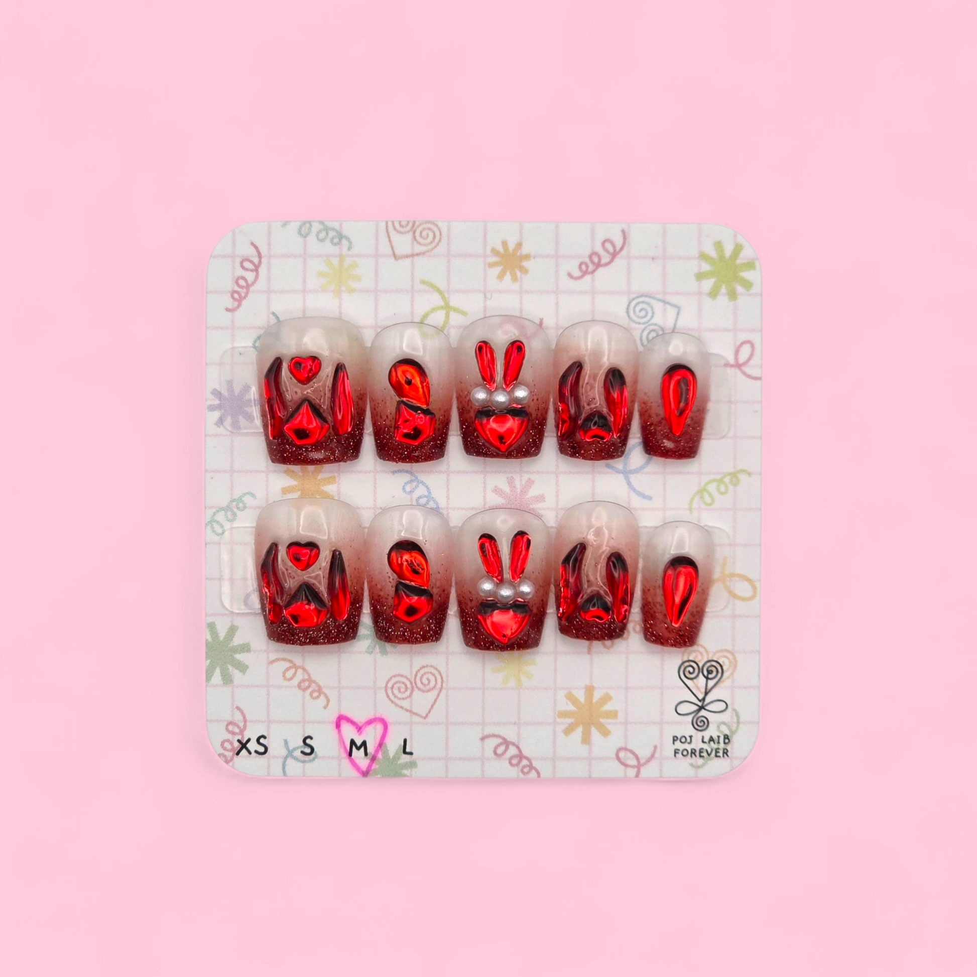 Bold red chrome meets soft blush tones in this playful set inspired by love and charm. Bunny ears, hearts, and tiny pearls bring a flirty twist that’s both sweet and daring. It’s the perfect match for anyone who loves to stand out and sparkle with confidence.
