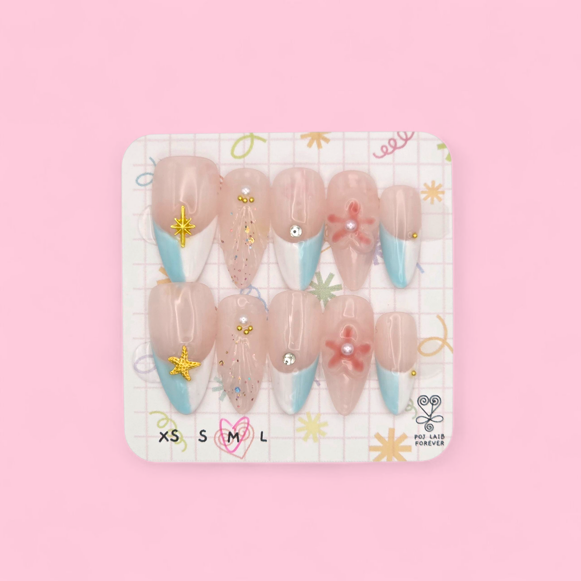 Soft pink seashell tones meet baby blue tips for a dreamy ocean-inspired look. Accented with gold stars, tiny pearls, and floral charms, this set captures that beachy sparkle with a touch of elegance. Perfect for anyone who loves soft glam with a playful twist.