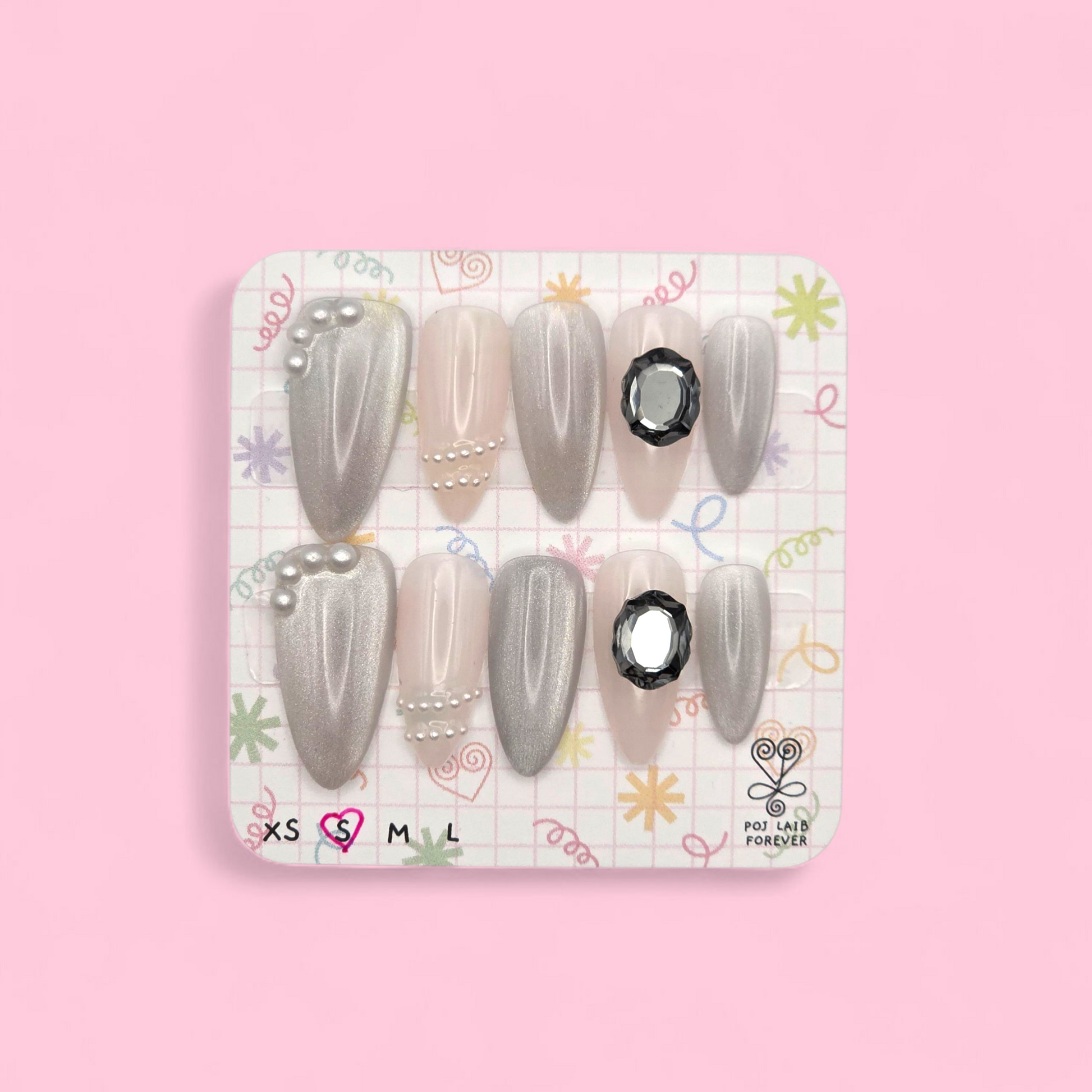 Shine bright with this glamorous set that mixes sleek silver shimmer with pearl accents and bold black gem statements. Perfect for parties, girls’ night out, or when you want your nails to be the life of the dance floor. These nails give you that extra sparkle and confidence to slay any outfit.