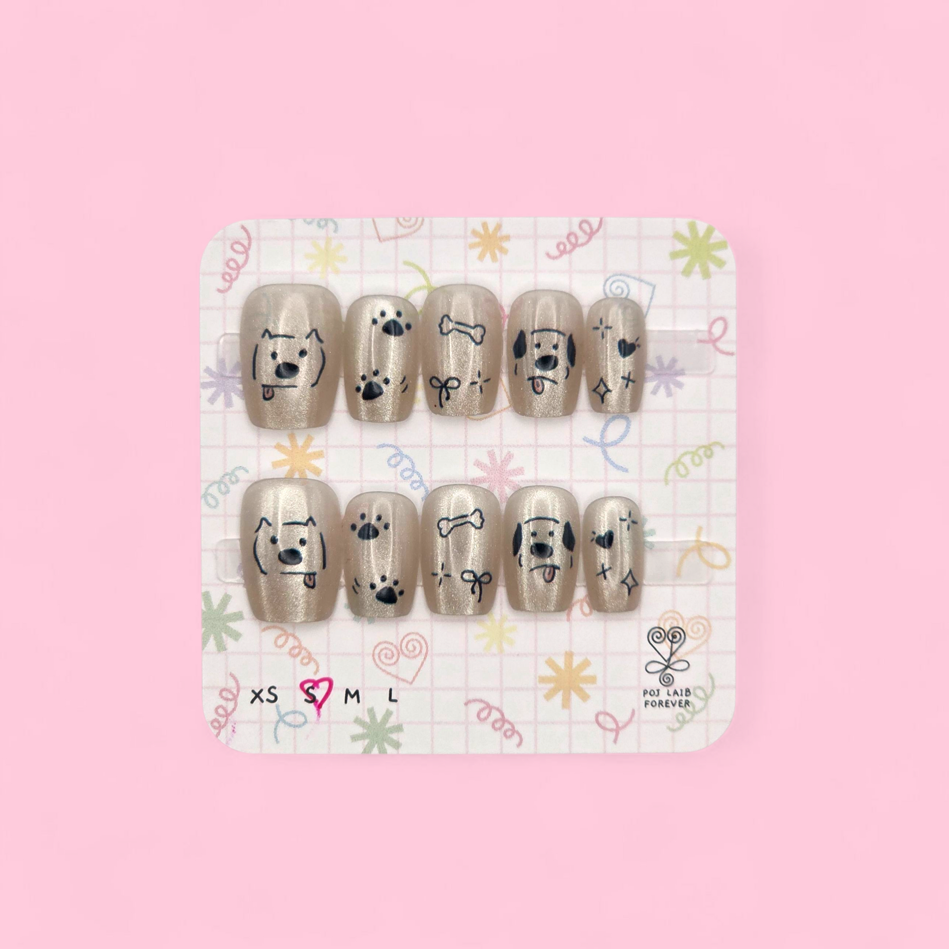 Show off your playful side with this adorable dog-themed nail set! Featuring tiny paw prints, bones, and puppy faces on a soft metallic base, it's perfect for pet lovers who want a hint of cuteness in their style. Whether you’re out walking your pup or just vibing with cozy energy, these nails bring pure joy to your fingertips.