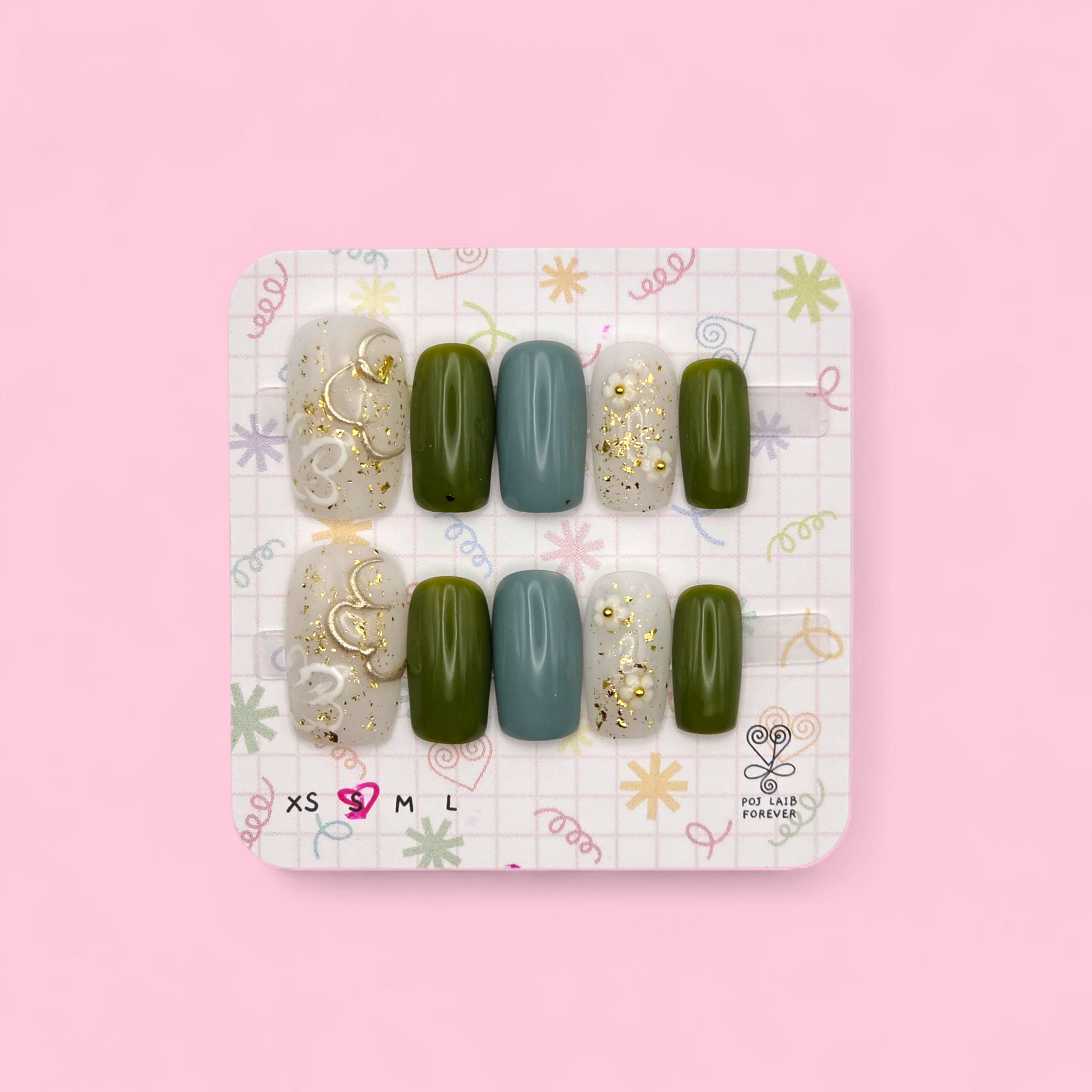 A mix of earthy greens, cool sage, and golden shimmer brings elegant forest vibes to this set. The little pearl and gold foil accents make it feel luxe yet grounded, like walking through a sunlit grove after rain. It’s perfect for anyone who loves nature with a touch of glam.