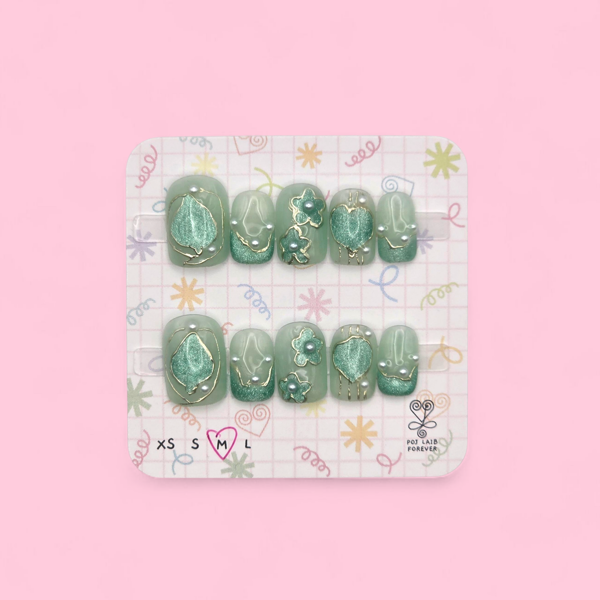 Soft, graceful, and effortlessly divine. The shimmer of jade green paired with gold floral details feels like a little garden blooming at your fingertips. Elegant yet playful, this set channels main character energy with a serene twist.