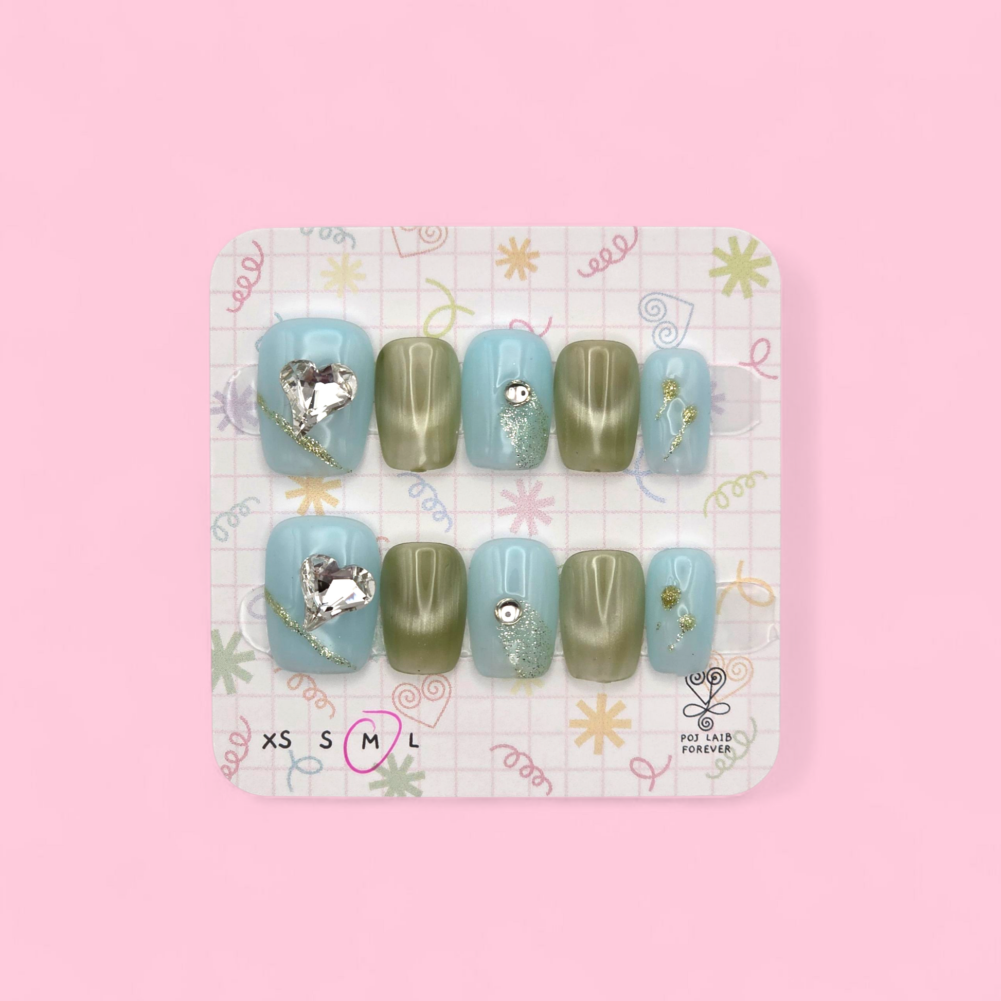 Dive into dreamy ocean vibes with this stunning mix of minty green and crystal blue shimmer. The jeweled hearts and glistening swirls sparkle like sunlight on waves giving major mermaid energy. It’s soft romantic and totally enchanting made for those who wear their heart with style.