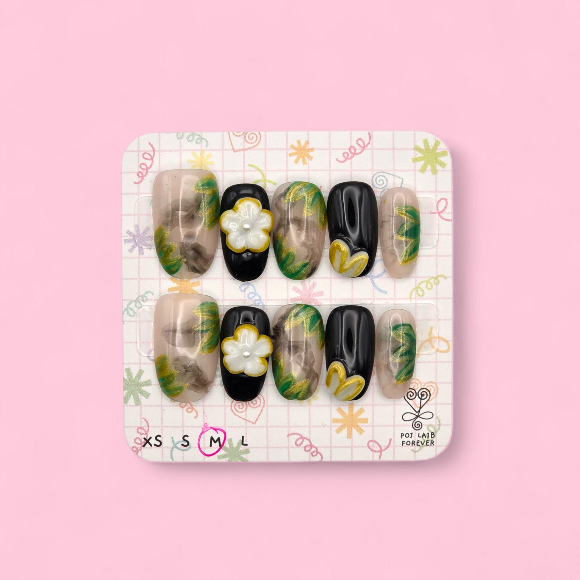 Bold black nails mixed with smoky greens and delicate flowers create a mysterious vibe. It’s edgy, artsy, and still super cute. Perfect for when you want to bloom loud and proud no matter the season.