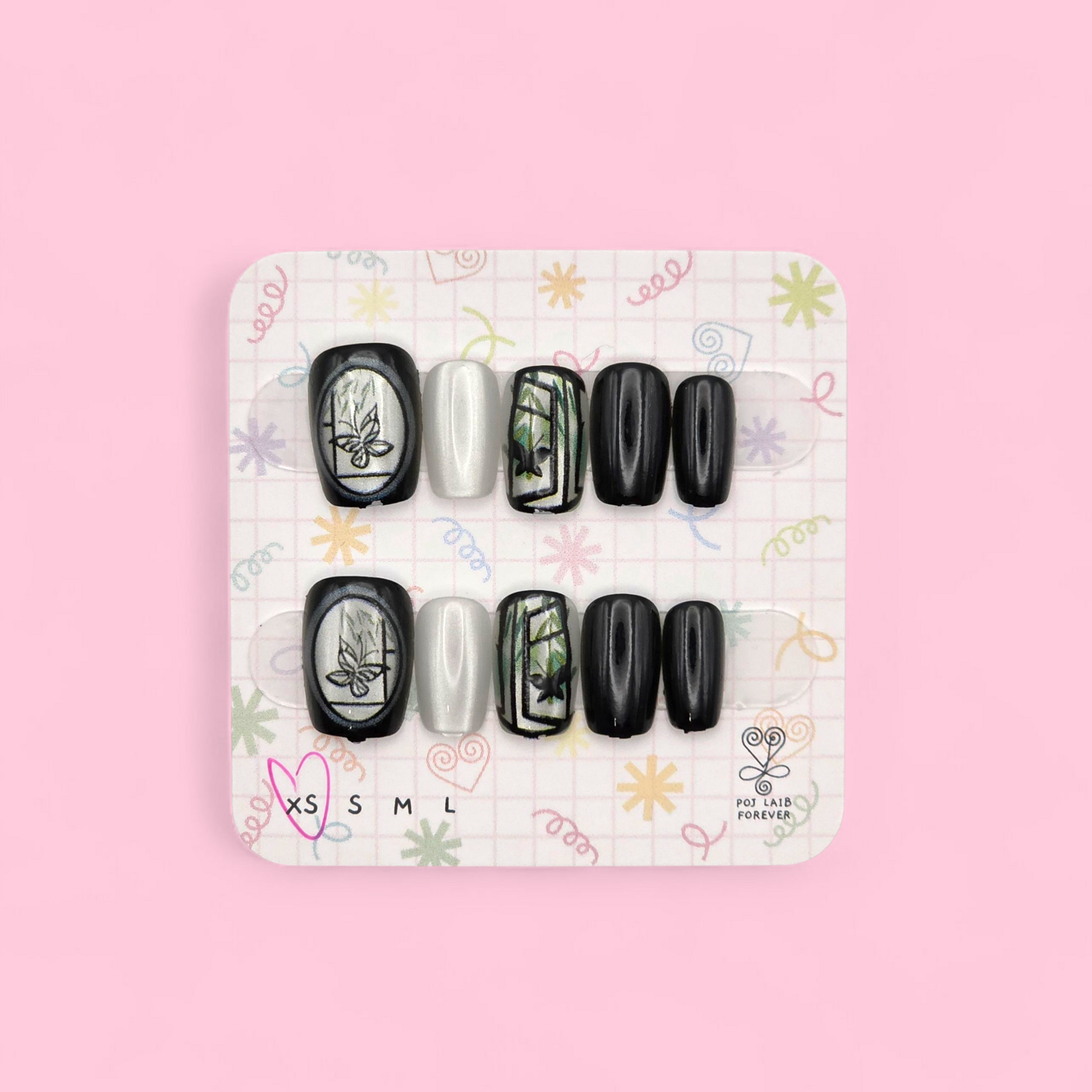 Bold black and pearly white nails with framed botanical accents, giving the look of tiny paintings at your fingertips. One nail has a slight chip, but the set is still totally wearable and gorgeous. Perfect if you love a chic, artsy vibe and don’t mind snagging a deal at a steal price.