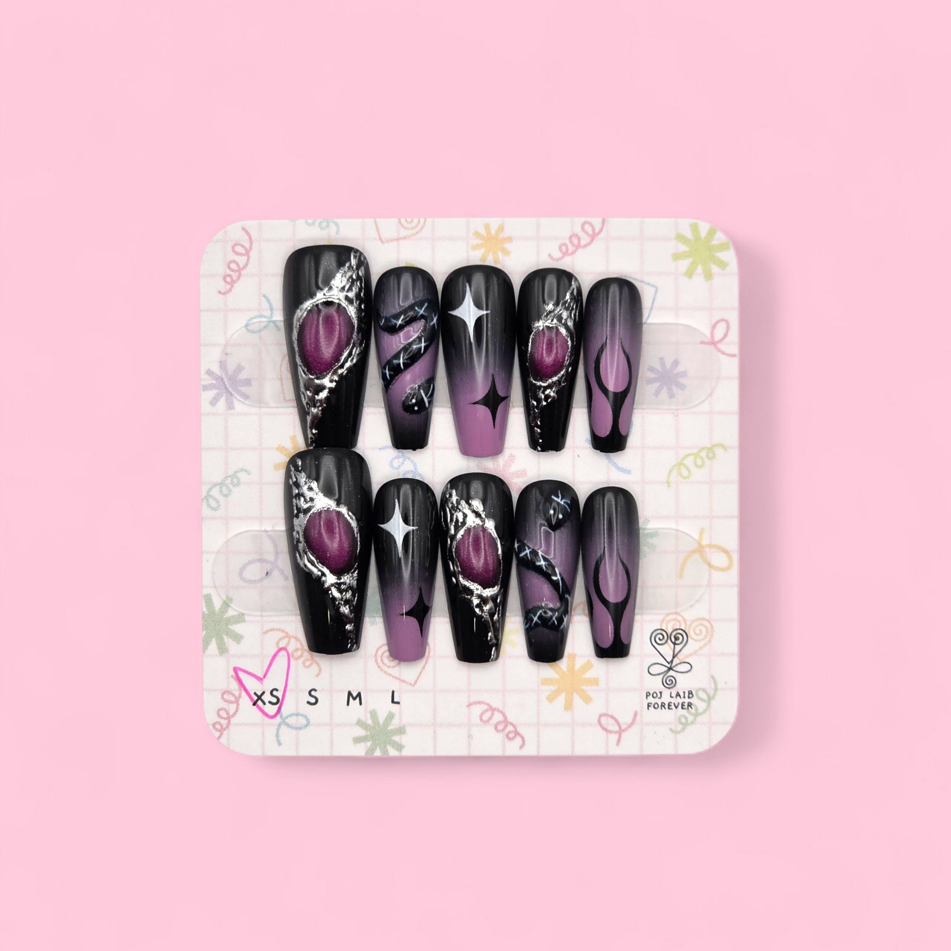 A bold mix of black and purple with edgy snake-inspired swirls and star details. This set is mysterious, cosmic, and full of attitude. Perfect for nights out or when you’re feeling fierce and unstoppable.