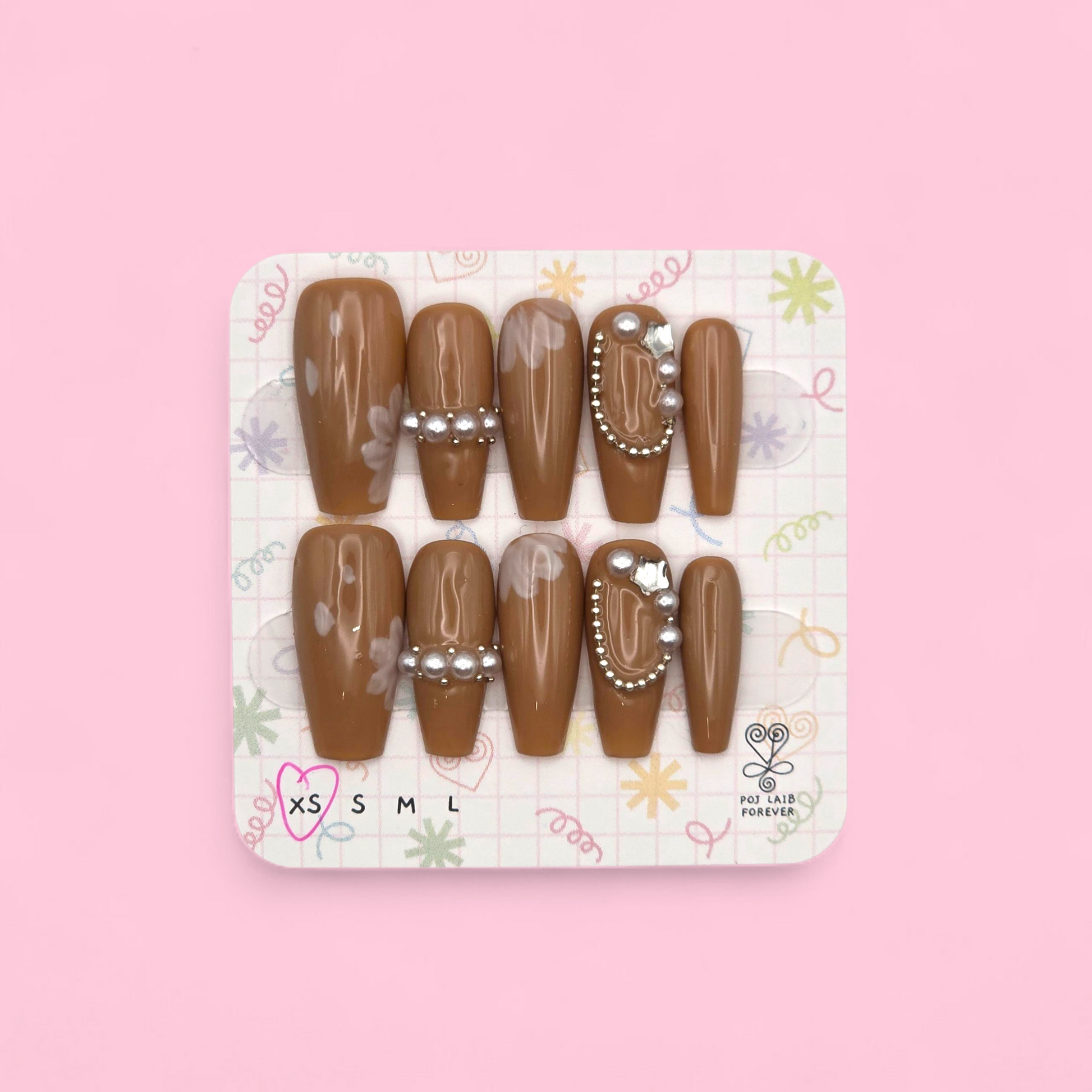 Warm mocha tones meet pearly accents and soft flower designs for a chic, modern look. The neutral base makes them versatile, while the 3D pearls add just the right amount of glam. Elegant with a cozy touch, perfect for fall or winter vibes.