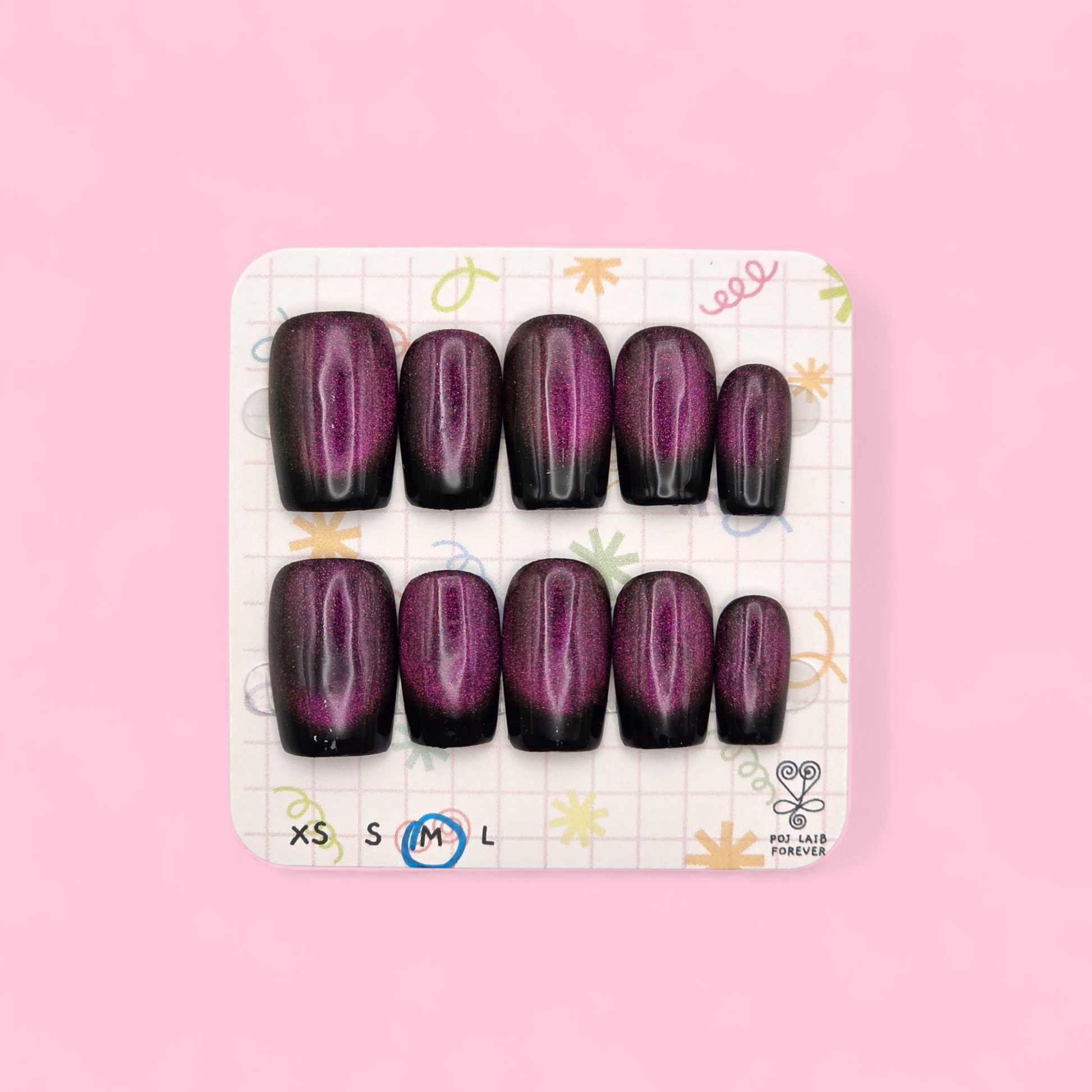 Rich purple shimmer wrapped in deep black gives this set its mysterious glow. The cat-eye effect shifts with every move making your nails look like they’re glowing from within. Bold seductive and smooth like velvet this set is made for those who love a little dark magic in their style.