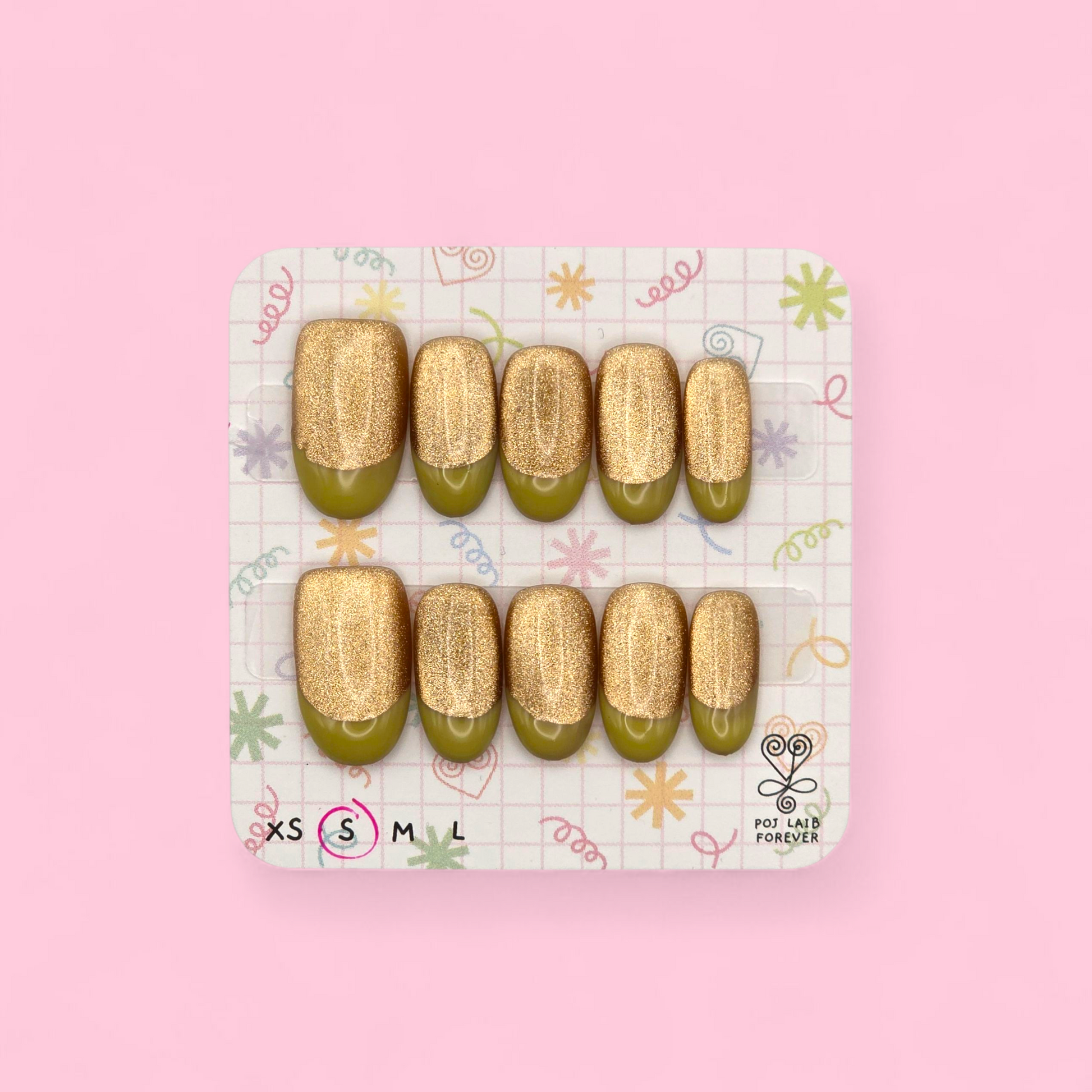 Like a glam cocktail for your nails, this set pairs olive tones with golden glitter. Fun, flirty, and ready to shine with every outfit. Cheers to sparkle season!