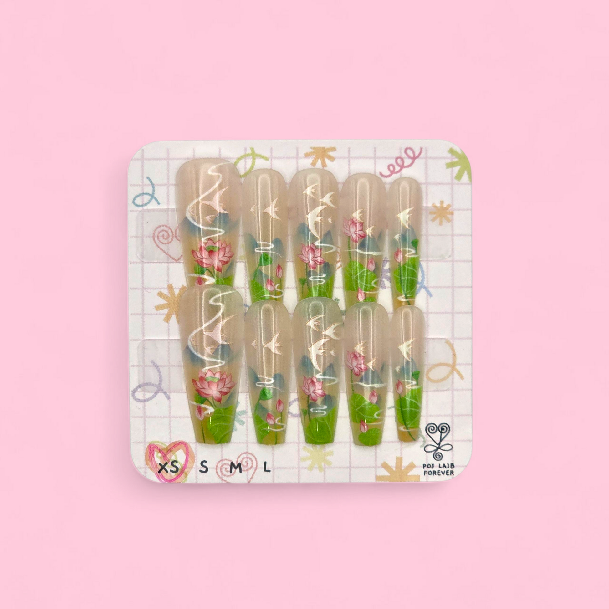 Soft clear nails bloom with delicate pink lotus flowers and lush green leaves, like a serene pond at your fingertips. The gentle design brings elegance and tranquility, making it a perfect choice for both everyday wear and special occasions. A beautiful set for anyone who loves floral, nature-inspired nails with a graceful twist.