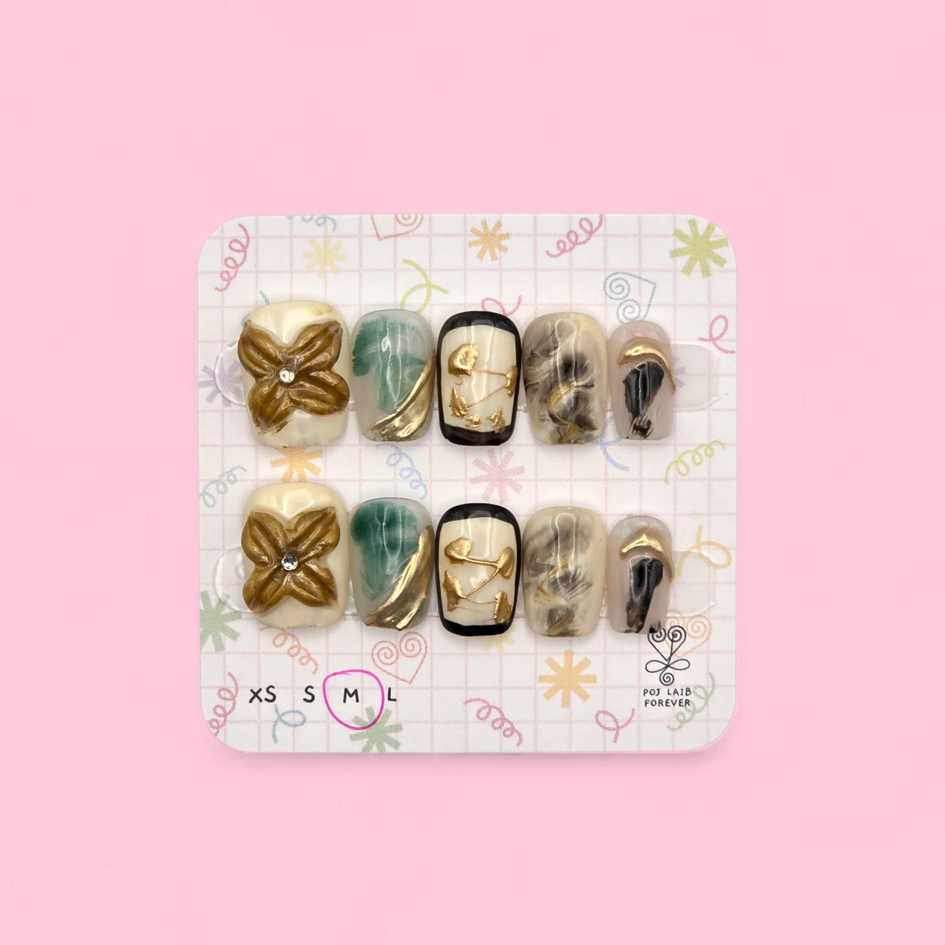 Art meets mystery in this captivating set that feels like moonlight mended with gold. Deep earthy tones melt into soft jade and cream, wrapped in flowing gold like cracks turned into beauty. It’s calm, powerful, and a little bit dangerous, made for the girl who turns her scars into art.