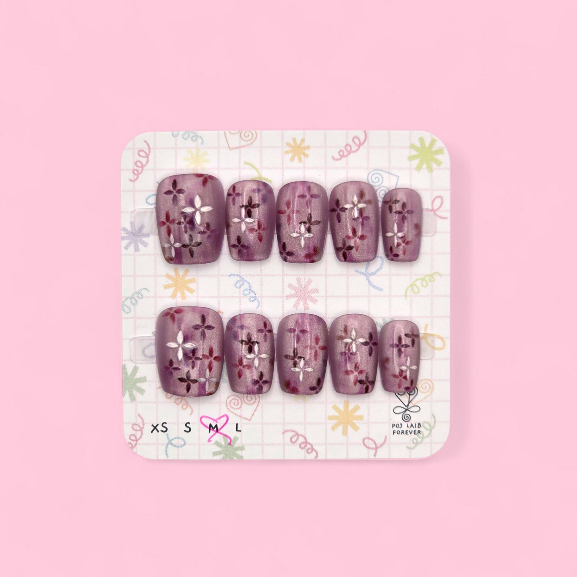 Soft purple shimmer meets delicate floral accents for a look that feels dreamy and romantic. The dainty blossoms sparkle like petals caught in a gentle breeze, adding a touch of whimsy to every gesture. Sweet, subtle, and effortlessly elegant, this set is perfect for those who love calm, feminine magic.